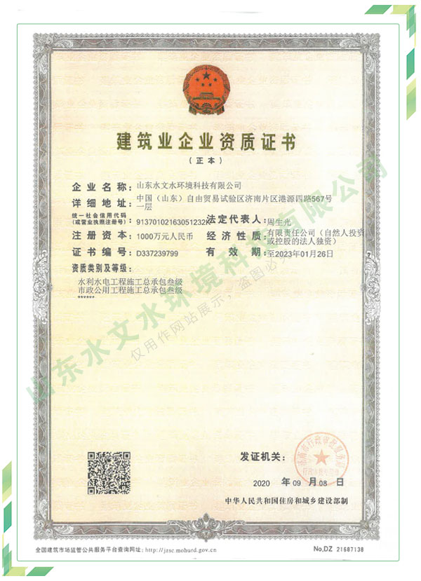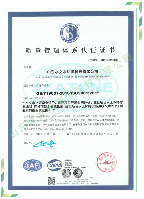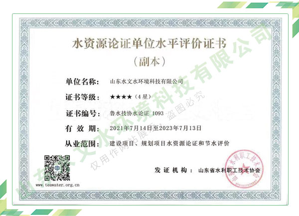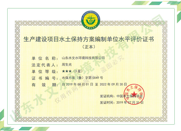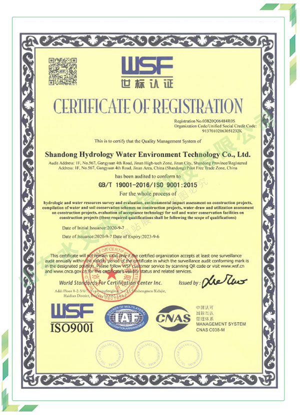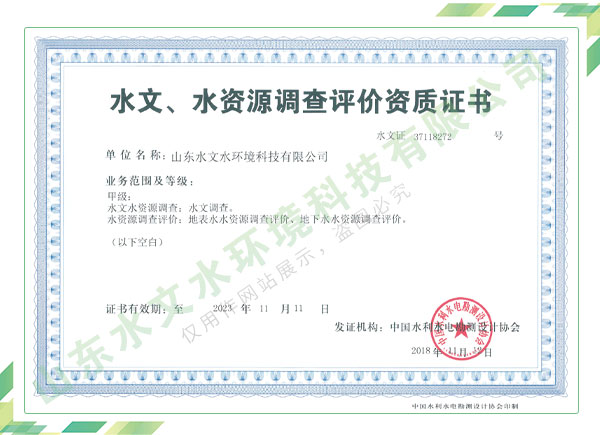 公司擁有水利工程設(shè)計、水土保持、水文水資源調(diào)查評價、水資源論證、建設(shè)項目環(huán)境影響評價、市政公用工程施工總承包、水利水電工程施工總承包、電子與智能化工程專業(yè)承包等資質(zhì),2017年通過質(zhì)量管理體系、環(huán)境管理體系、職業(yè)健康安全管理體系認證;2020年被評為國家級高新技術(shù)企業(yè),同年被中國水利企業(yè)協(xié)會推薦為第一批“合同節(jié)水服務(wù)企業(yè)”;2021年被山東省、濟南市評為 “專精特新”中小企業(yè)。業(yè)務(wù)范圍涉及水利工程設(shè)計;節(jié)水設(shè)計、改造、水平衡測試;山洪災(zāi)害調(diào)查;城市水資源調(diào)查評價;建設(shè)項目水土保持方案編制、監(jiān)測、驗收、水土保持規(guī)劃;水安全保障規(guī)劃、建設(shè)項目水資源論證、規(guī)劃水資源論證;建設(shè)項目環(huán)境影響評價;入河排污口論證;防洪影響評價;市政公用工程施工、水利水電工程施工、電子與智能化工程施工等。